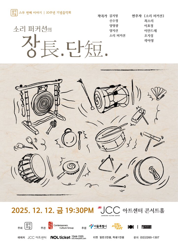 2025.12.12. 저녁 7시 30분 음악오늘 스무번째 이야기 <장.단.> 대학로 JCC아트센터 Posted byjisunyang12025년 December 11일Posted inNews 12월 12일 금요일 저녁 저의 새로운 작품 네 명의 타악기 연주자를 위한 ‘딱따구리 드러밍’ 공연합니다. 많은 관심과 참여 부탁드립니다. 이 글 공유하기: Share on X (Opens in new window) X Share on Facebook (Opens in new window) Facebook Like Loading... Related